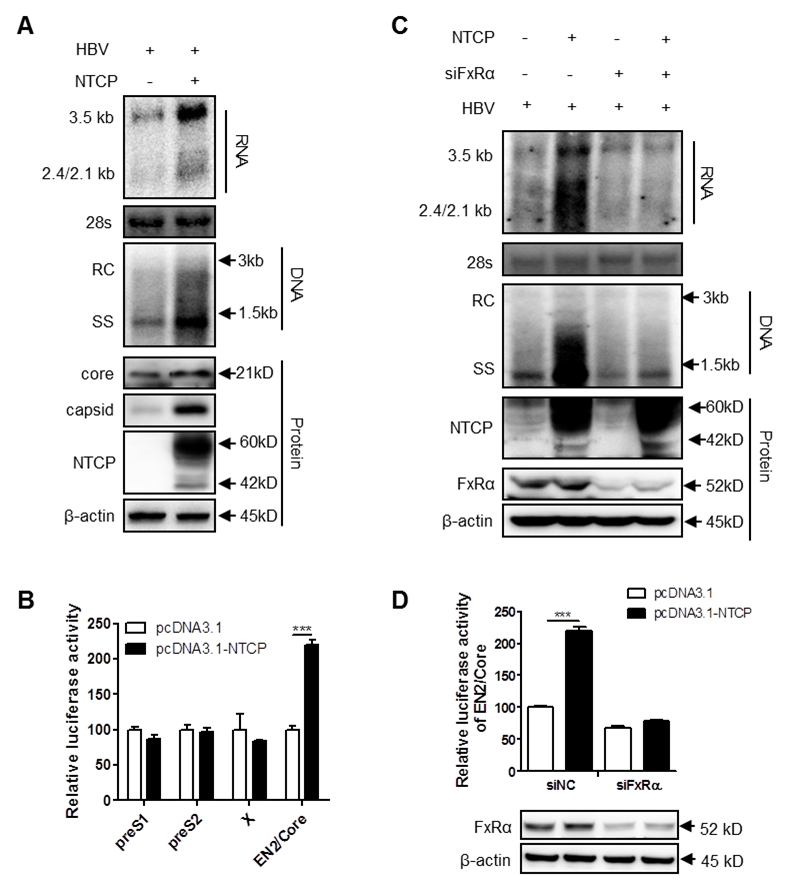 图1. NTCP通过激活核受体FxRa上调HBV EN2/Core启动子活性