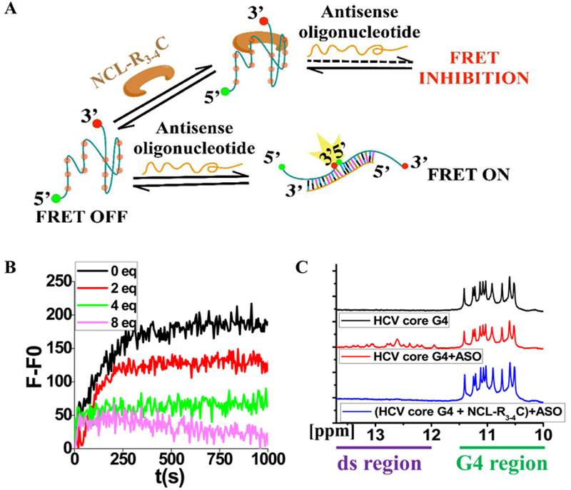 图示:FRET (A、B) 和NMR (C) 显示细胞NCL蛋白能稳定HCV core G4结构