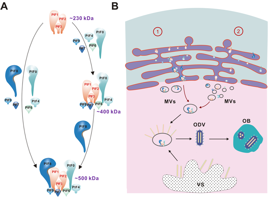 杆状病毒是一类昆虫特异性病毒,在害虫的生物防治和外源基因的表达等方面有重要的应用价值。杆状病毒入侵宿主昆虫依赖于病毒囊膜上的一系列口服感染因子(per os infectivityfactors, PIFs),其中大部分PIF会以蛋白复合物的形式发挥功能,然而该复合物的组成及装配机制并不清楚。该研究对三种不同杆状病毒PIF复合物进行了Blue native PAGE分离、质谱鉴定和Westernblot分析,揭示PIF复合物大小为500 kDa, 包括9种组分(PIF0-4,PIF6-9),其中PIF9为新发现的口服感染因子。利用人工合成技术对复合物中的9个成员逐一进行了敲除,发现PIF1、2和3是核心成分,它们形成一个~230 kDa的核心复合物,为完整复合物的组装提供了平台(图A)。通过核-质分离,在胞质中检测到完整的PIF复合物,提出了复合物在细胞内装配和运输的模式图(图B)。该研究系统地分析了杆状病毒PIF复合物的组成和组装,为今后研究该复合物的结构和功能奠定了基础,被审稿人认为“Thiswill be a landmark paper in the baculovirus field” (这将成为杆状病毒研究领域的一个标志性论文)。
