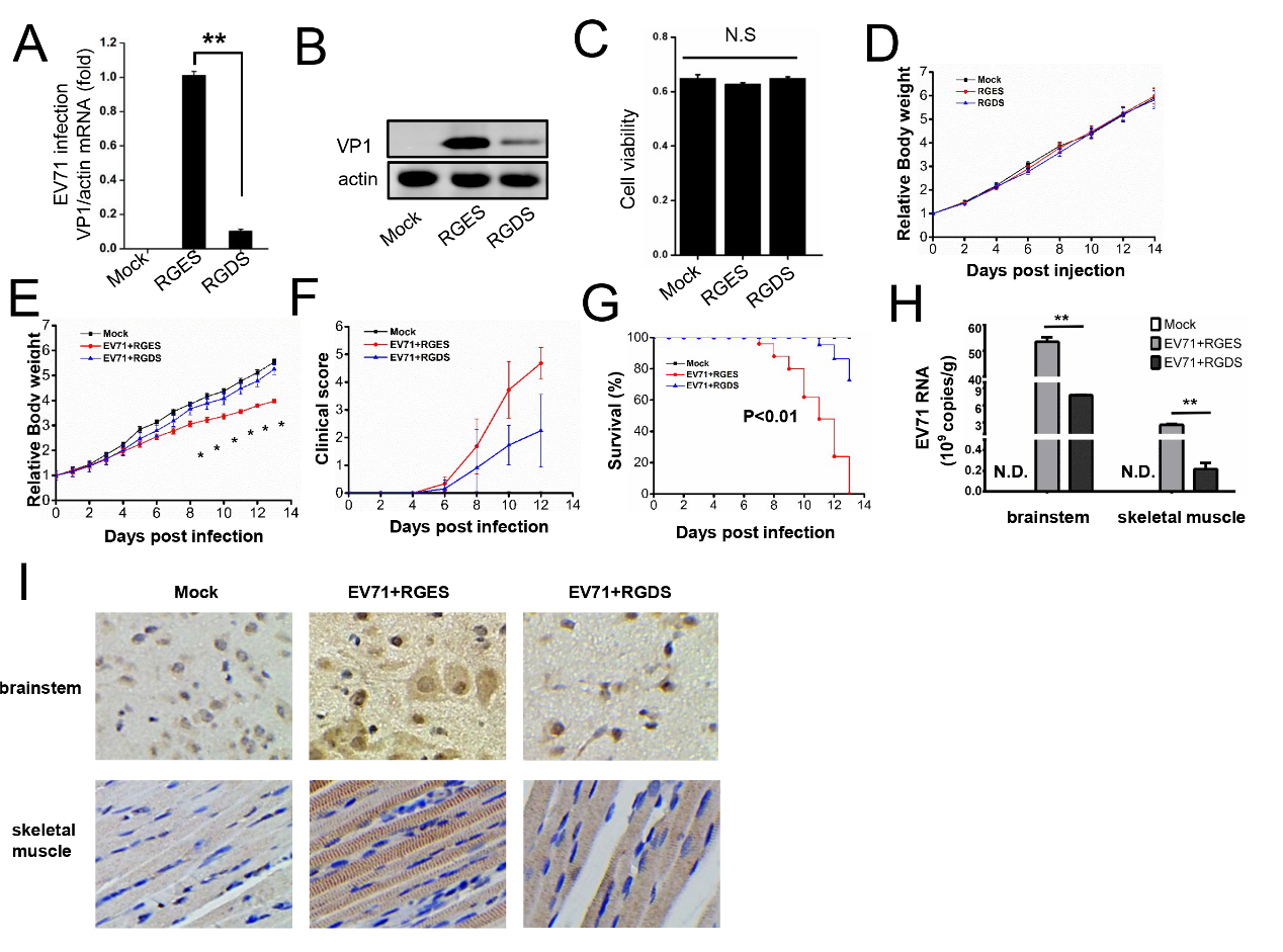 图示:RGDS多肽在细胞和动物水平显著抑制EV71复制