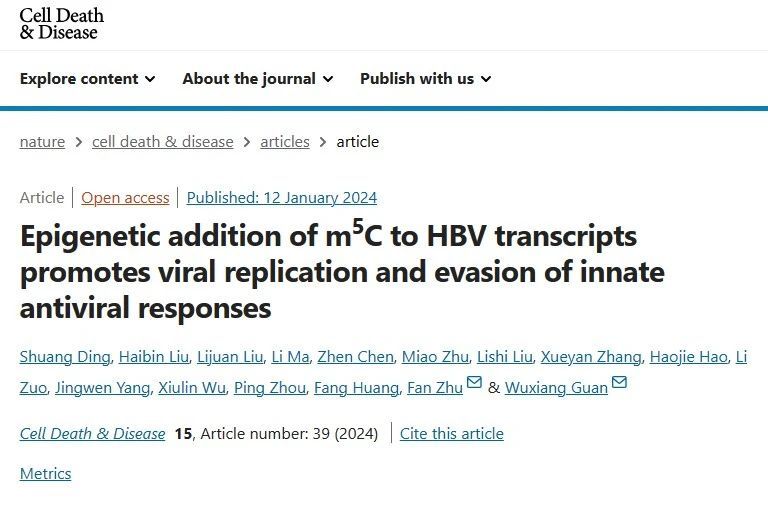 2024年1月12日,武汉大学病毒学国家重点实验室朱帆研究组和中国科学院武汉病毒研究所关武祥研究组合作在国际学术期刊Cell Death & Disease 在线发表了题为“Epigenetic addition of m5C to HBV transcripts promotes viral replication and evasion of innate antiviral responses”的研究论文。该研究揭示了乙型肝炎病毒(HBV)利用m5C修饰,既抑制宿主的天然免疫反应,又促进自身复制的新机制。