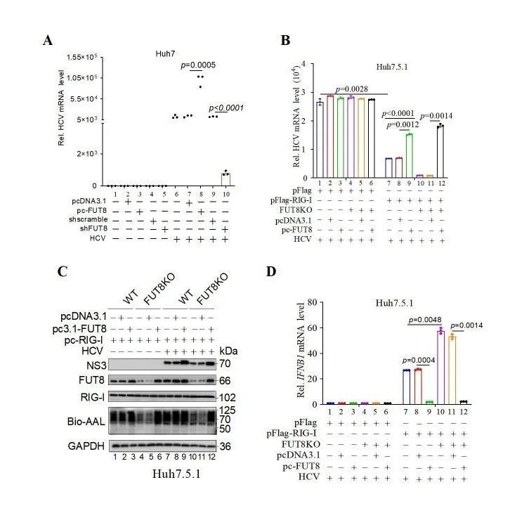图2. FUT8可以显著增加HCV RNA复制和表达,而敲低FUT8在肝细胞Huh7细胞中表现出相反的效果