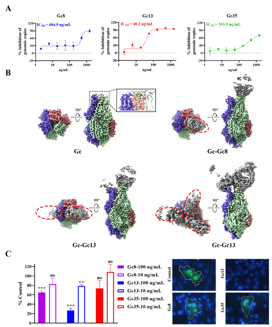 图1:CCHFV中和单抗筛选及作用机制研究。A.体外中和活性测定;B.单抗Fab片段与Gc蛋白的冷冻电镜结构解析;C.单抗Gc8和Gc13抑制病毒Gc蛋白介导的膜融合。