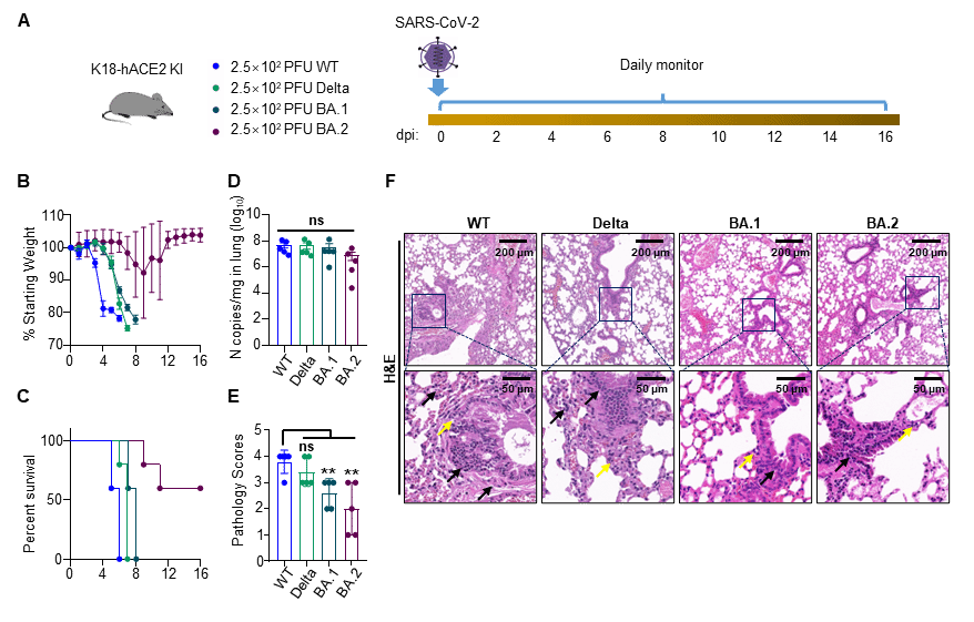 图3. SARS-CoV-2 WT、Delta、Omicron BA.1和Omicron BA.2毒株在K18-hACE2 KI小鼠中的致病性。