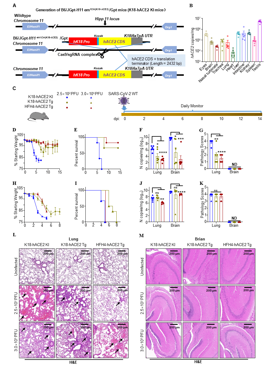 研究人员利用CRISPR-Cas9技术,将K18启动子驱动的人ACE2基因敲入小鼠的hip11位点,构建了稳定表达人ACE2的转基因小鼠(K18-hACE2 KI mouse)。为了评估该小鼠模型对SARS-CoV-2的敏感性,研究人员利用之前已有报道的K18-hACE2 Tg和HFH4-hACE2 Tg小鼠,与K18-hACE2 KI小鼠一同进行了SARS-CoV-2感染实验。实验结果显示,低剂量的SARS-CoV-2 WT(2.5×102 PFU)可有效感染K18-hACE2 KI小鼠且造成严重的肺部损伤和100%的死亡率,而低剂量病毒感染K18-hACE2 Tg小鼠和HFH4-hACE2 Tg小鼠的肺损伤有限,三分之一的K18-hACE2 Tg小鼠感染后死亡,六分之一的HFH4-hACE2 Tg小鼠感染后死亡。这些数据表明我们基于K18-hACE2 KI小鼠构建的小鼠感染模型是一种模拟COVID-19重症肺炎的致死性模型,对SARS-CoV-2感染更敏感(图1)。