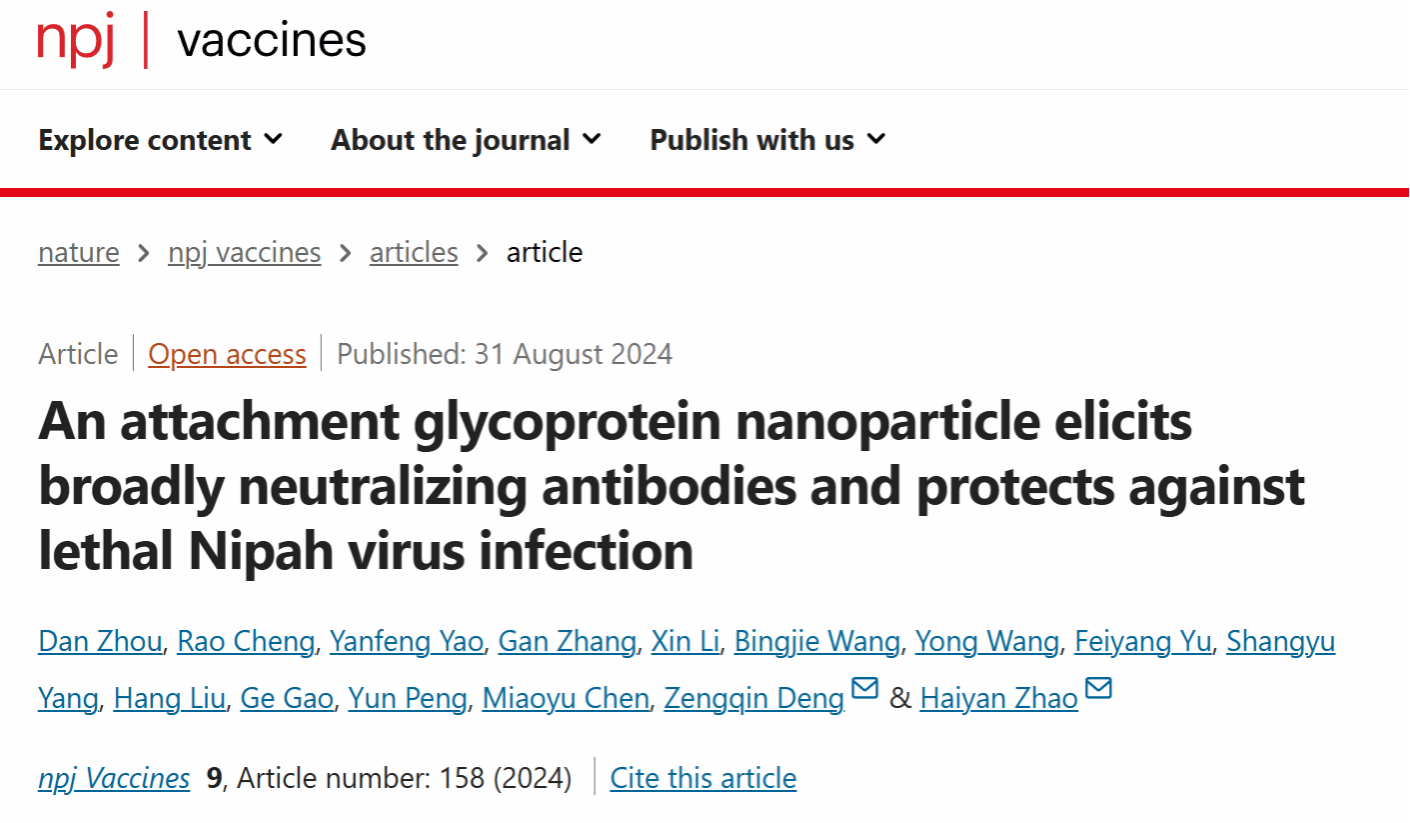 2024年8月31日,武汉大学病毒学国家重点实验室赵海艳团队和中国科学院武汉病毒研究所邓增钦团队合作在npj Vaccines上发表题为“An attachment glycoprotein nanoparticle elicits broadly neutralizing antibodies and protects against lethal Nipah virus infection”的研究论文。本研究以尼帕病毒G蛋白头部域为抗原靶标,成功开发出一种新型的、安全有效的自组装蛋白纳米颗粒疫苗,该疫苗能够诱导抑制多种亨尼帕病毒感染的广谱中和抗体,并对尼帕病毒感染的仓鼠提供完全保护。
