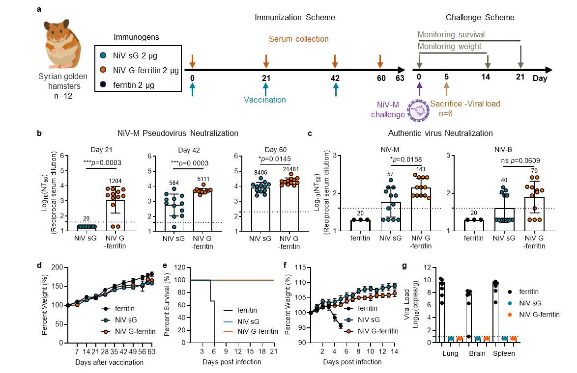 图2. NiV G-ferritin保护叙利亚金黄仓鼠免受NiV-Malaysia致死性感染