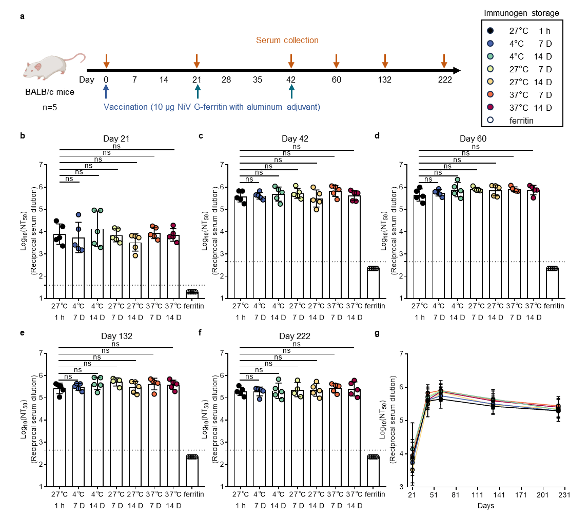尼帕病毒(Nipah Virus,NiV)是一种具有高致病性和广泛宿主的人兽共患病毒,感染人类后致死率可高达75%。NiV能够感染多种哺乳动物,包括与人类生活密切相关的猪、猫、狗和马等;同时该病毒既可通过被污染的食物传播给人类,也能通过接触感染的动物或人的分泌物和排泄物感染人类。病毒感染人体后,感染者会出现发热、头痛、和呕吐等症状,严重者还会出现急性呼吸系统疾病和致命性脑炎等。目前虽然有一些正在研发的疫苗和抗病毒药物,但是临床上仍然缺乏获批的特异性防治手段,开发新的预防和治疗性候选疫苗和药物迫在眉睫。NiV的G(glycoprotein)蛋白是病毒粒子表面的一种结构蛋白,在NiV与宿主细胞的吸附和进入过程中发挥着重要作用,也是中和抗体产生的主要靶抗原。本研究选取G蛋白头部域作为抗原靶标,以铁蛋白(以下称为ferritin)为载体,成功制备得到了大小均一、单分散的NiV G-ferritin纳米颗粒免疫原。将可溶性的G蛋白(NiV-sG)和NiV G-ferritin纳米颗粒免疫小鼠后,小鼠体内均产生了良好的体液免疫反应,但相较于NiV-sG,NiV G-ferritin可以在小鼠体内更快速地诱导高中和活性和广谱性的血清抗体反应,诱导血清能够有效地中和三种致病性亨帕病毒(NiV-Malaysia、NiV-Bangladesh和Hendra Virus)的感染。研究人员进一步比较了NiV G-ferritin在不同温度储存条件下的稳定性,结果发现NiV G-ferritin在所有测试条件下诱导的体液免疫反应水平相当,并且在三免六个月后,所有免疫组小鼠的血清仍能高效地抑制尼帕病毒的感染,表明即使在37℃下储存两周,NiV G-ferritin也能诱导持久而强大的体液免疫反应(图1)。