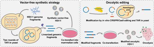 图:HSV-1的人工合成平台的优化策略及其在溶瘤病毒构建中的应用示意图