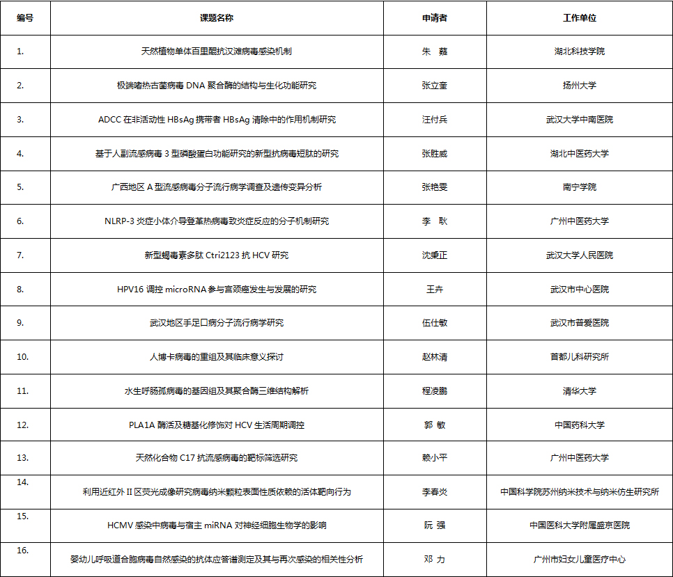 2016年病毒学国家重点实验室开放课题获批汇总表